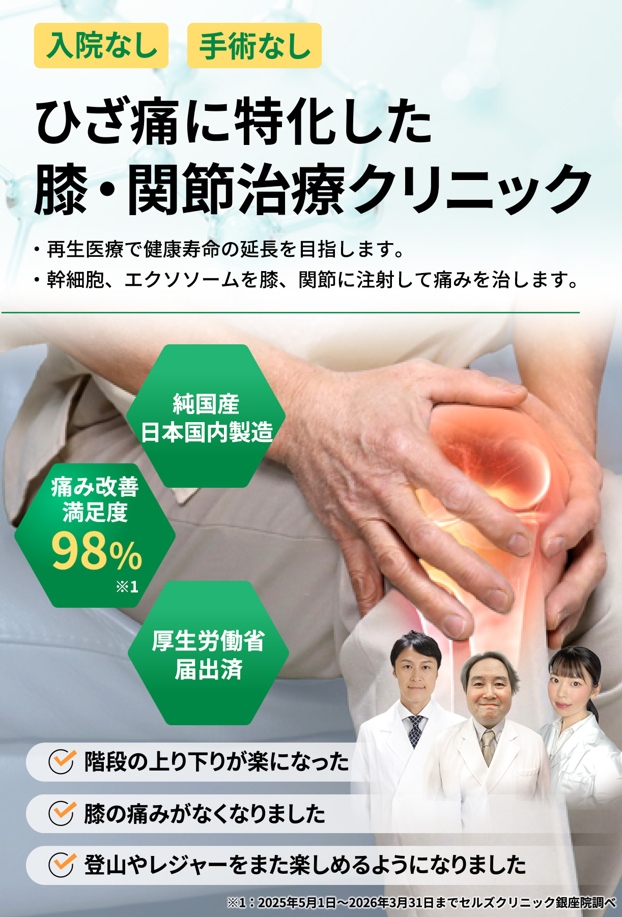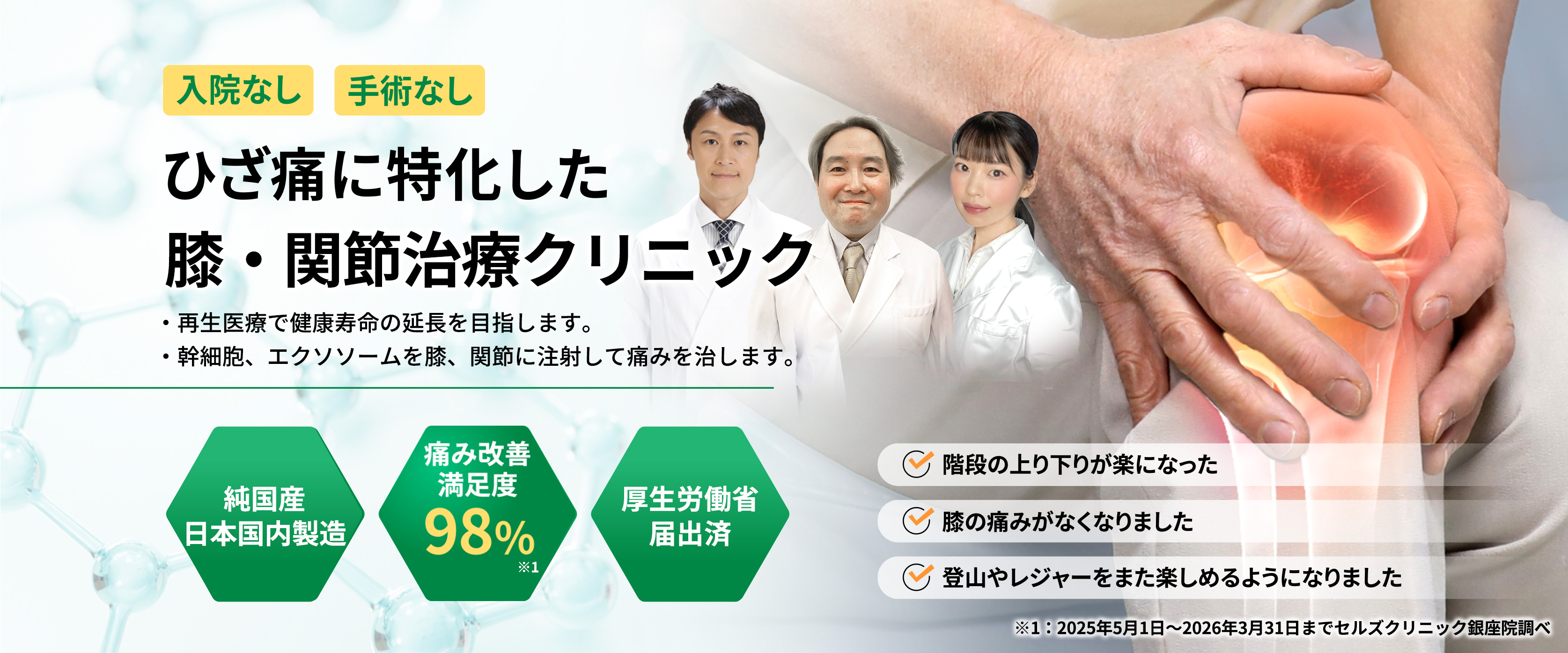 セルズクリニック銀座院では、患者様が抱えるひざの痛みの軽減・解消はもちろんのこと、治療後により快適な生活を継続できるように、最後まで全力でサポートさせて頂きます。